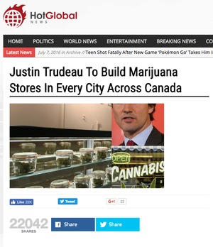 Since then, Hot Global News has published roughly 40 fake news articles about Trudeau. The hoaxes include Trudeau banning Uber in Canada, Trudeau naming a kitten "Kush," Trudeau and Obama accidentally kissing at a State Dinner at theWhite House, Trudeau giving out marijuana at Halloween, Trudeau canceling his plan to legalize marijuana, and Trudeau declaring that he is "the next Nelson Mandela."